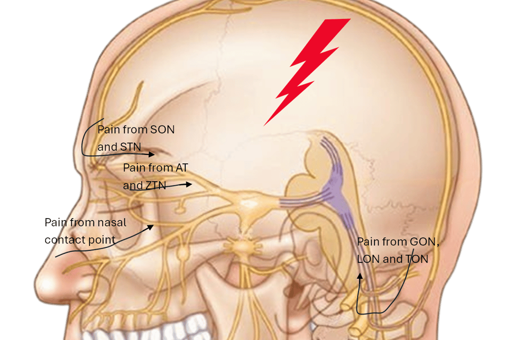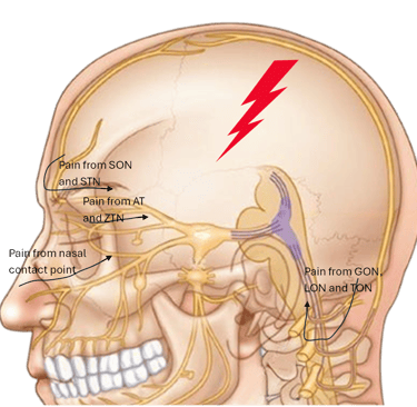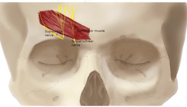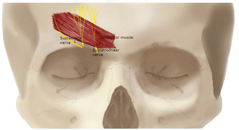 The supraorbital and supratrochlear nerves are compressed in the brow/forehead by the corrugator muscle and fascial bands