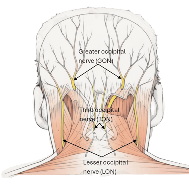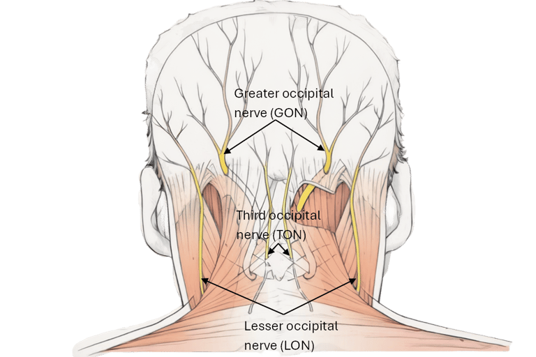 The greater occipital, lesser occipital and third occipital nerves are compressed in the back of the neck by the semispinalis and trapezius muscles, fascial bands, and the occipital artery