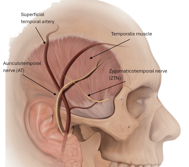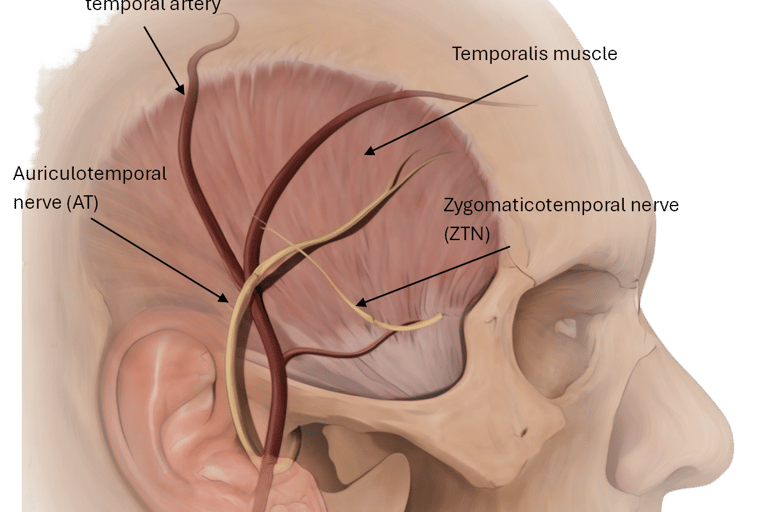 The auriculotemporal and zygomaticotemporal nerves are compressed in the temple by the temporalis muscle and the superficial temporal artery