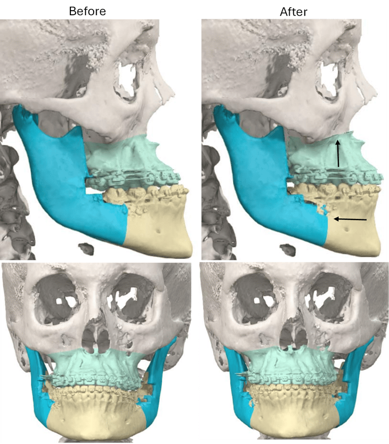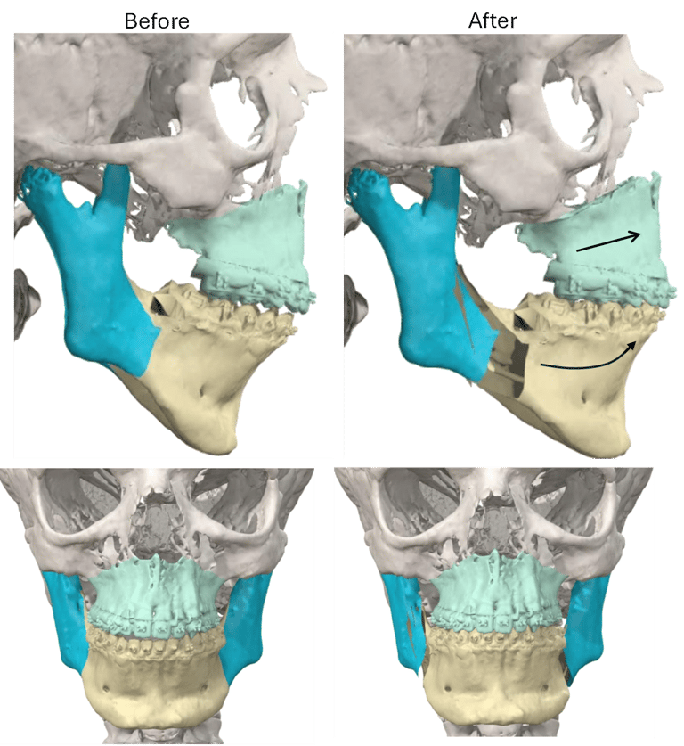 LeFort 1 advancement and impaction (shortening) of the maxilla (upper jaw) and BSSO advancement/rotation of the mandible (lower jaw) for a patient with obstructive sleep apnea and anterior open bite