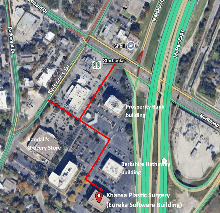 You can enter our parking lot next to Starbucks (on Northland Dr), or through the Randall's parking lot (on Balcones Dr)